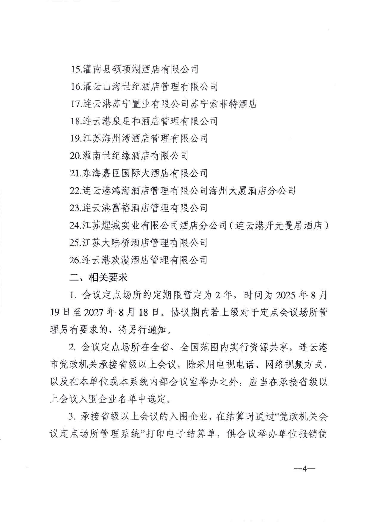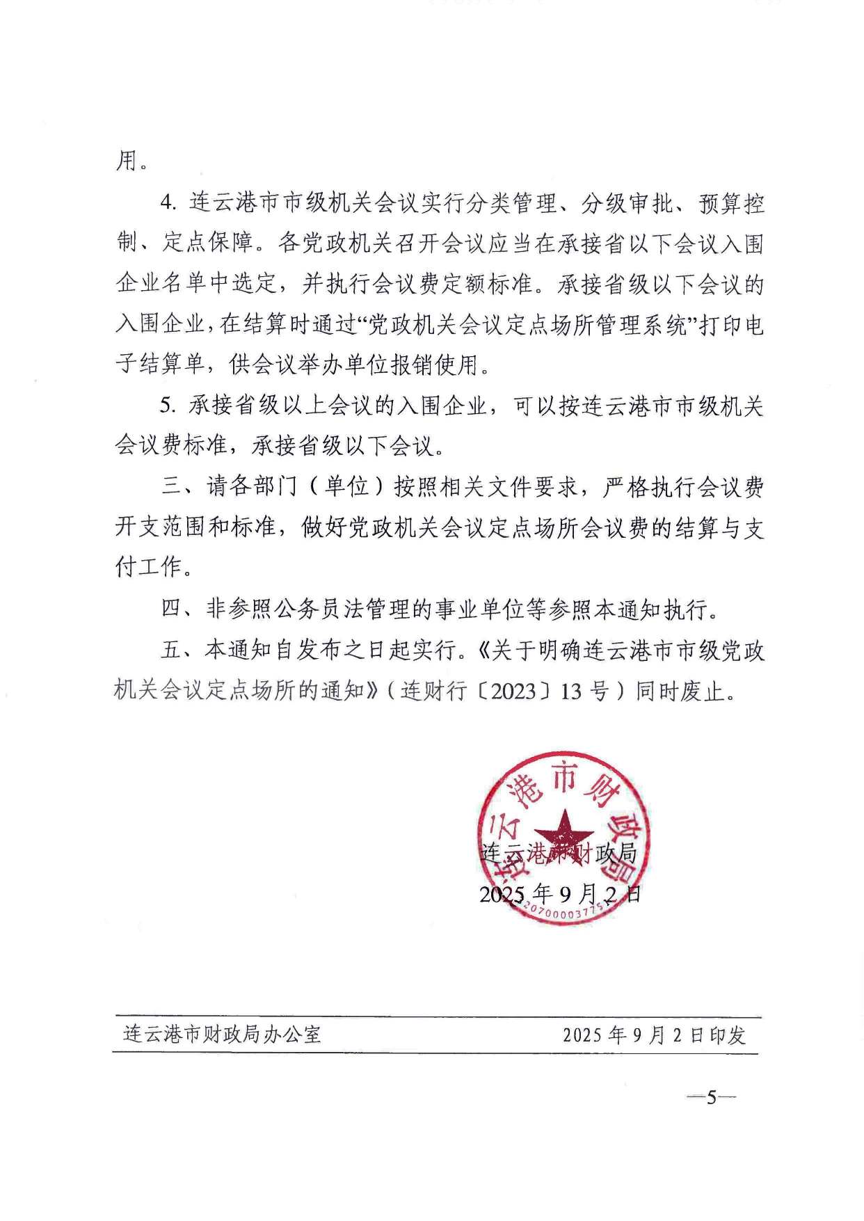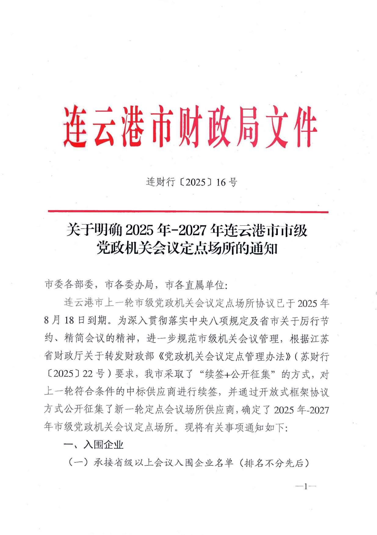 【会议定点】关于明确2025年-2027年连云港市市级党政机关会议定点场所的通知(连财行〔2025〕16号)