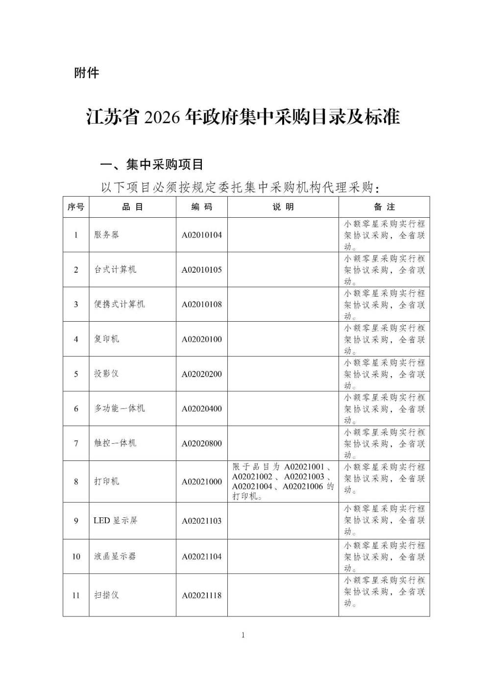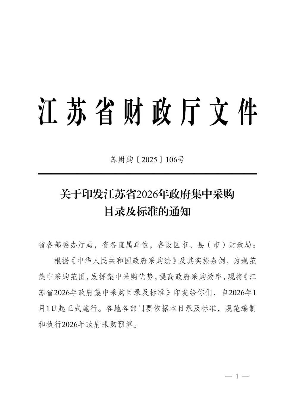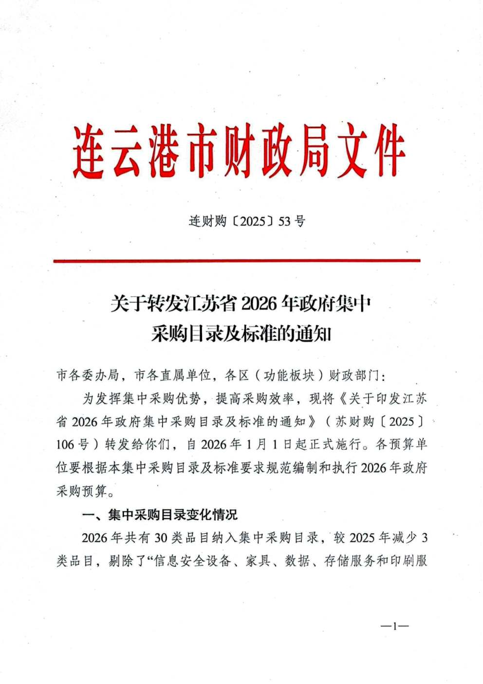 【集中采购目录】关于转发江苏省2026年政府集中采购目录及标准的通知(连财购〔2025〕53号)