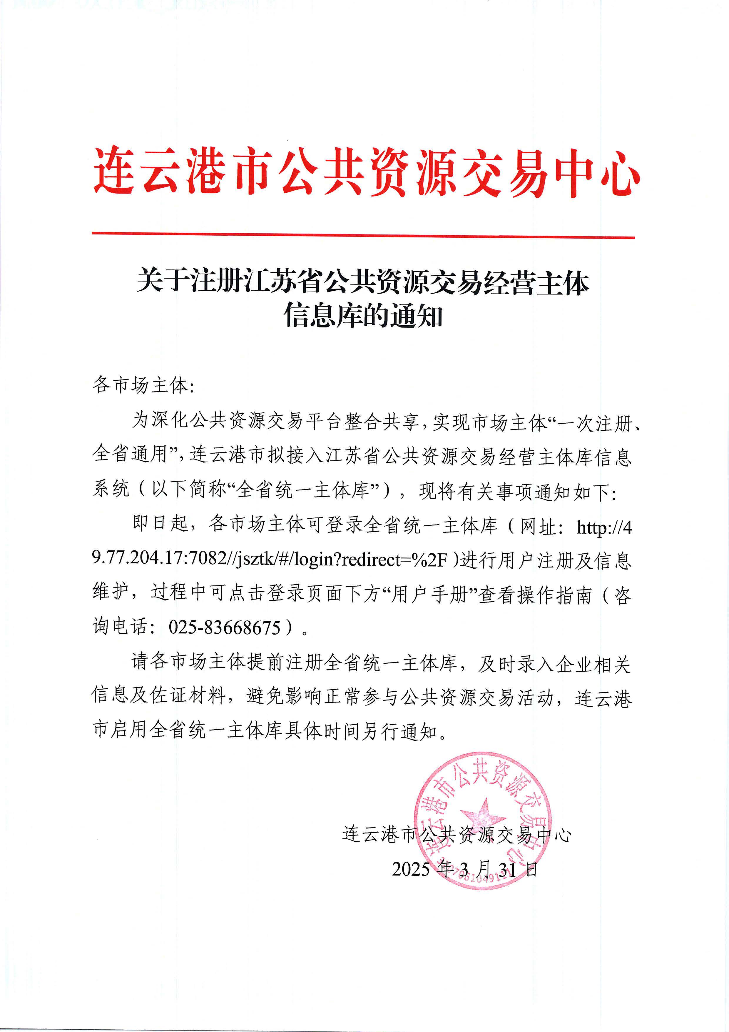 关于注册江苏省公共资源交易经营主体信息库的通知