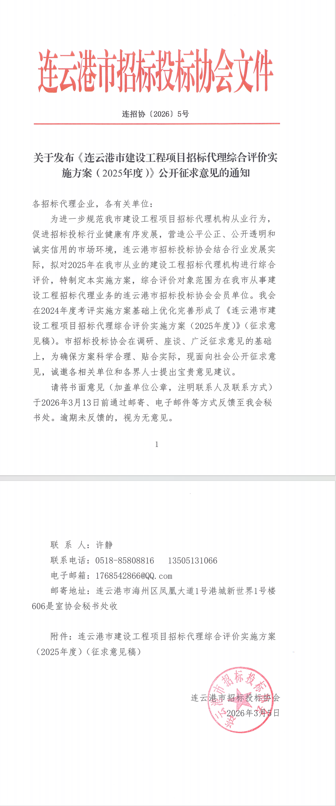 关于发布《连云港市建设工程项目招标代理综合评价实施方案(2025年度)》公开征求意见的通知